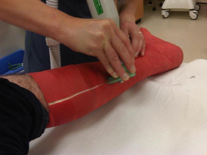 I catch the train back up to Derby to have the temporary cast removed so they can check the wound and put on a more permanent one. As they take it off I have some irrational fear that my foot is going to fall off. I feel hot, nauseous and almost faint. I recover and have a nice Saintly red cast applied. The consultant is on holiday in four weeks’ time so I have to have this on for 5 weeks, so seven in total. Gits.