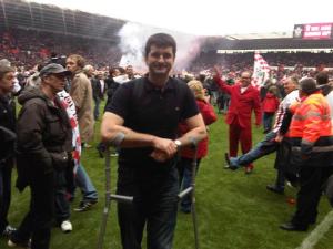 Back in Southampton for the final game of the season. Learning my lesson from the Pompey game, I have a seat in the front row. The Saints win promotion back to the Premier League with a thumping 4-0 win over Coventry. Unfortunately, I remember very little as I slipped on some spilt beer in the concourse just before the game and reopened the wound on my toe, resulting in spending the whole game in total agony.