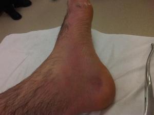 My ankle seems to have recovered so I find myself playing for Ashbourne 2XV against Bakewell. We score early and Bakewell restart. A team mate gathers the ball and I support him. Unfortunately, the entire Bakewell pack is there next before anyone else from Ashbourne and we both get flattened. Somewhere under the weight of the other 9 men, my left ankle is turned again. After a bit of magic sponge I continue but after going over on my ankle a further three times I become more of a hindrance and am substituted. My ankle soon swells up to a considerable size.